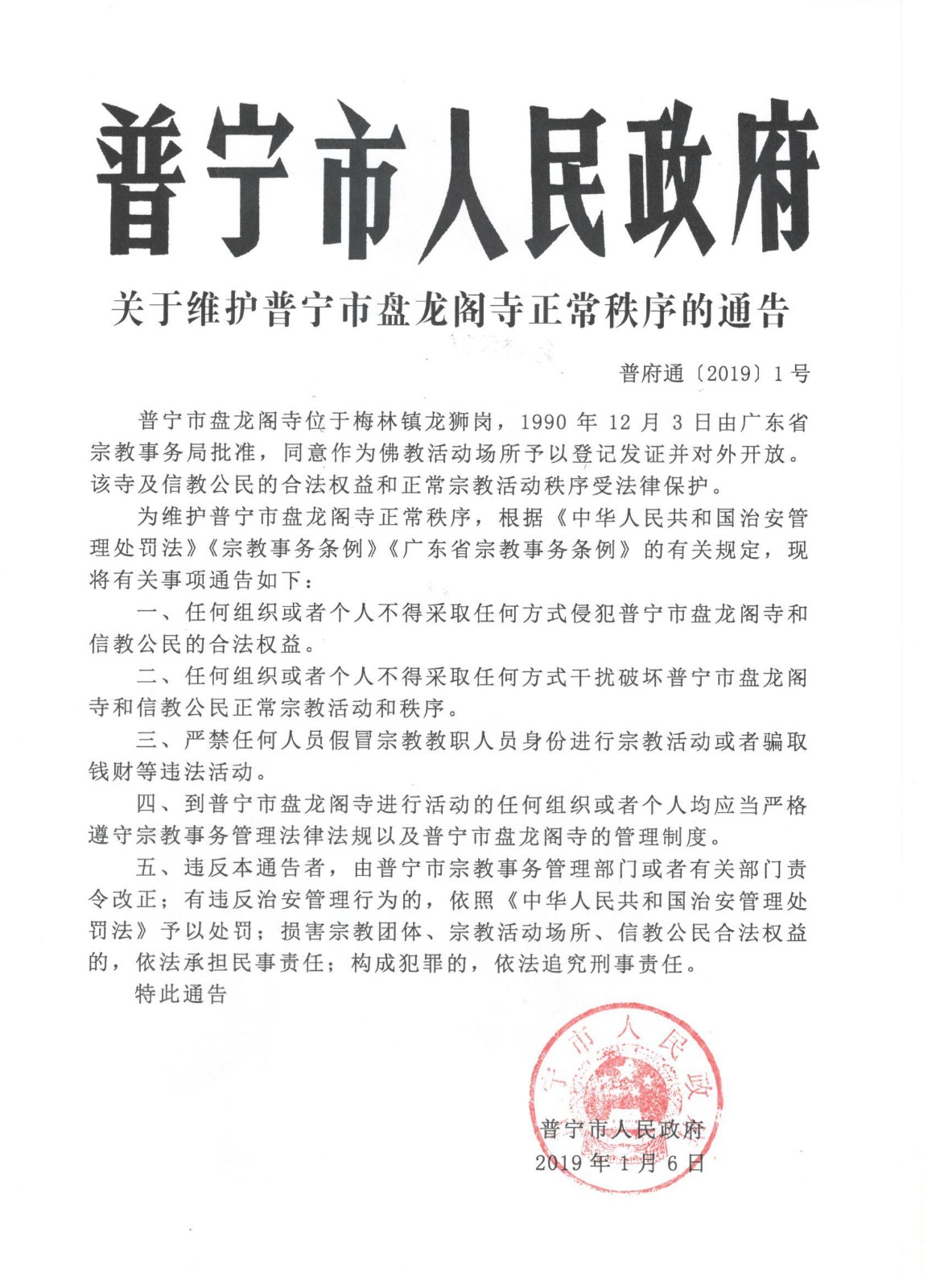 關(guān)于維護(hù)普寧市盤(pán)龍閣寺正常秩序的通告