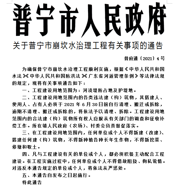 關于普寧市崩坎水治理工程有關事項的通告