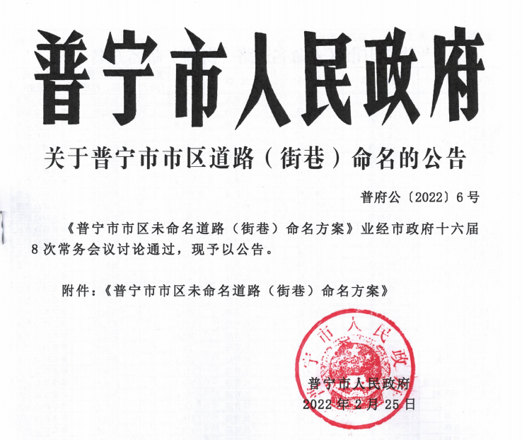 關于普寧市市區(qū)道路(街巷)命名的公告