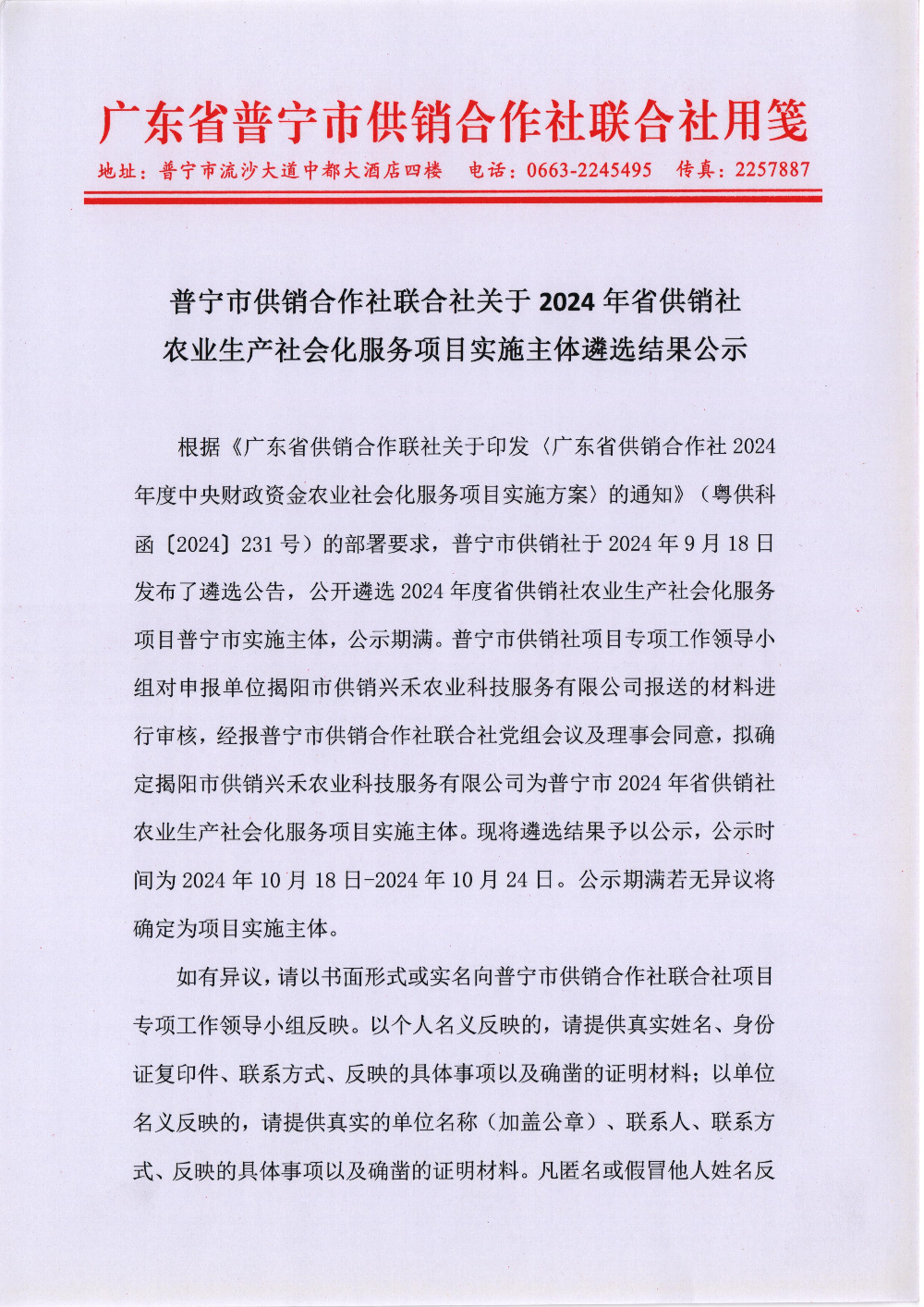 普寧市供銷合作社聯(lián)合社關(guān)于2024年省供銷社農(nóng)業(yè)生產(chǎn)社會(huì)化服務(wù)項(xiàng)目實(shí)施主體遴選結(jié)果公示
