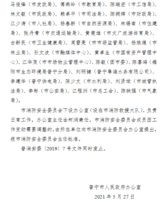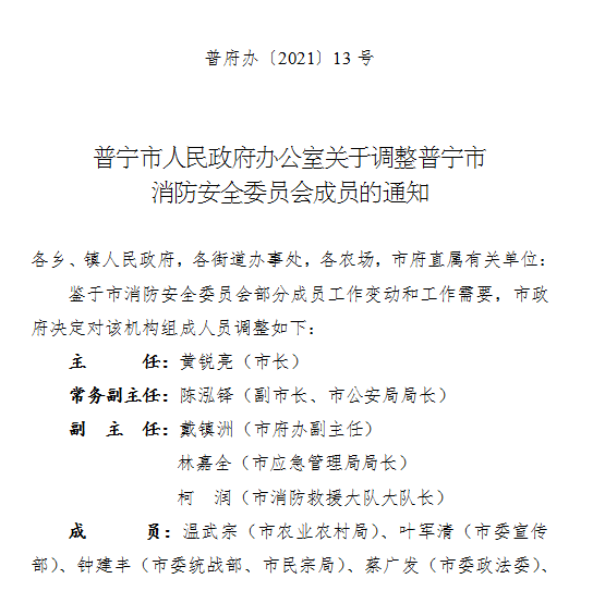 普寧市人民政府辦公室關(guān)于調(diào)整普寧市消防安全委員會(huì)成員的通知