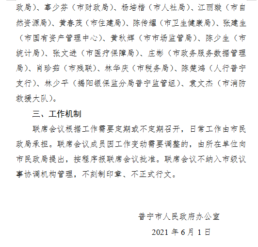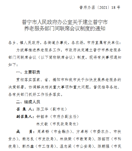 普寧市人民政府辦公室關(guān)于建立普寧市養(yǎng)老服務(wù)部門間聯(lián)席會議制度的通知